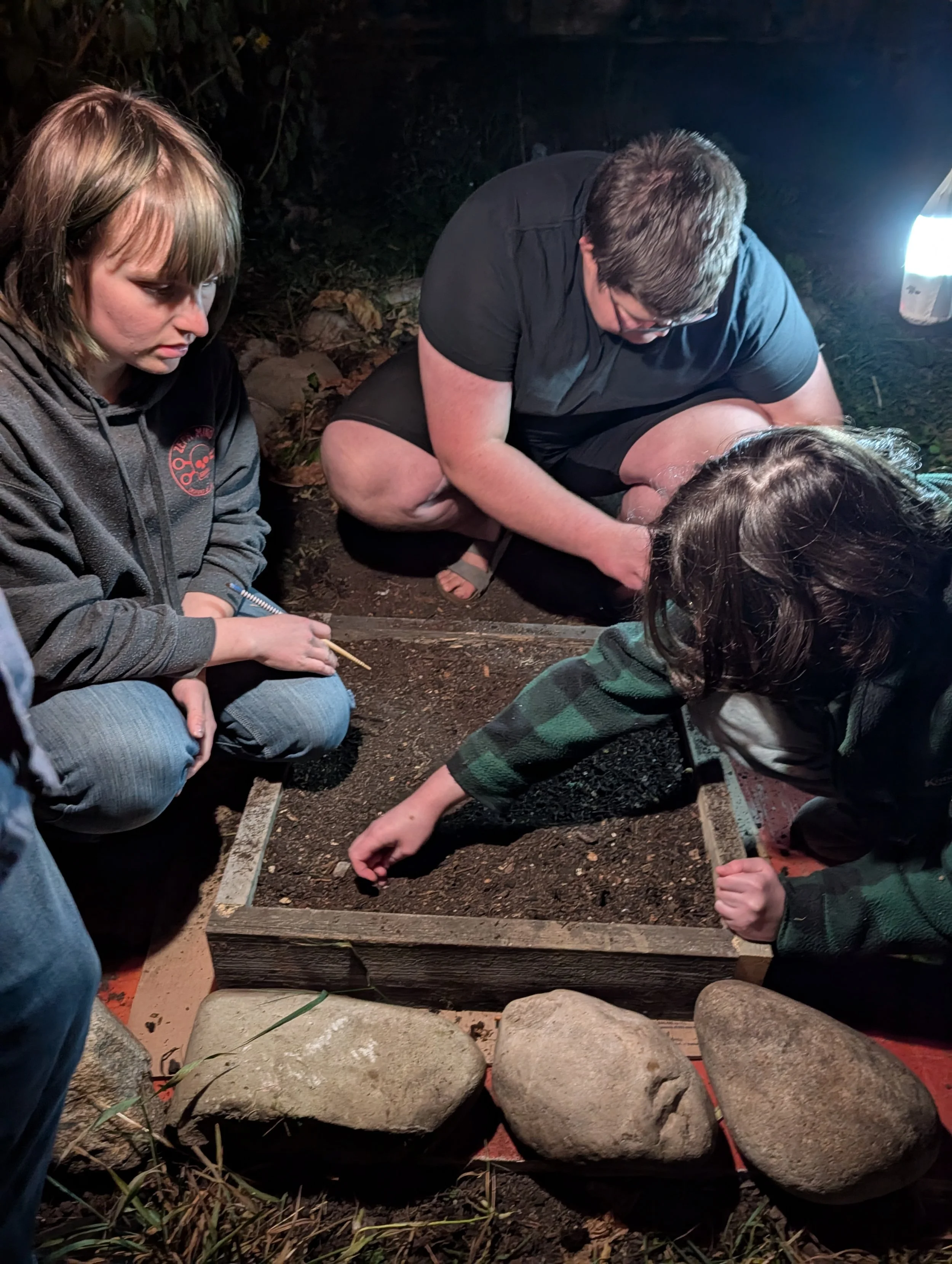 Volunteers seeding our longtrees nursery (yes, it is a box of soil on the ground) with bristlecone pines, October 2025.